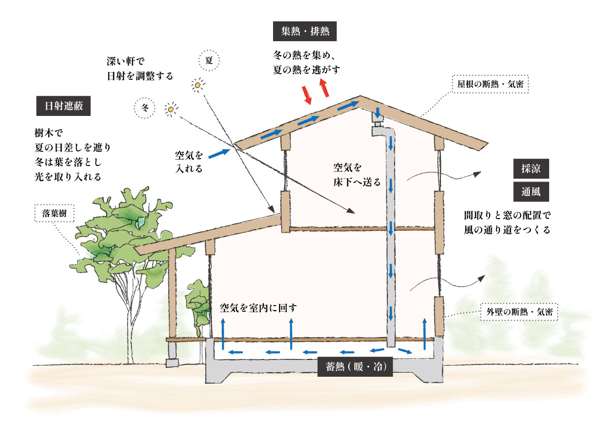 「集熱・蓄熱・排熱・日射遮蔽・通風・採涼」で実現します。